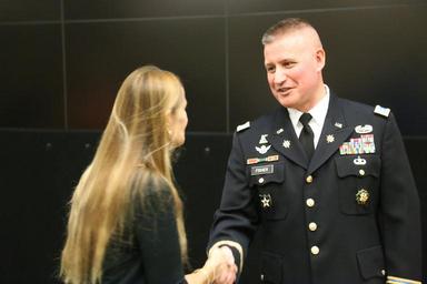 | Keywords: Lt. Gen. Kenneth R. Dahl, commanding general for U.S. Army Installation Management Command, greets Maj. Mark A. Fisher and his family at IMCOM headquarters Sept. 30, 2016, in advance of his promotion ceremony to lieutenant colonel. Family, coworkers and friends gathered at the operations center to hear the call to orders and join together in a receiving line and reception afterward. Dahl read an excerpt from a vintage copy of "The Armed Forces Officer" to inspire Fisher and the audience. (U.S. Army photo by Robert Dozier) |