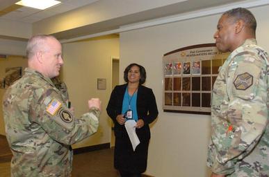 | Keywords: Lt. Gen. Kevin Mangum (left), Deputy Commanding General and Chief of Staff for U.S. Army Training and Doctrine Command, talks to Maj. Gen. LaWarren Patterson (right) of U.S. Army Installation Management Command, April 19, 2016, at IMCOM Headquarters on Joint Base San Antonio, Texas. (U.S. Army photo by Geralyn Smith Noah) |