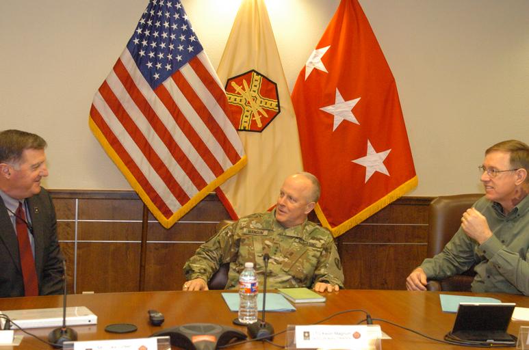 MAKE A MEME View Large Image Kevin Mangum (center), Deputy Commanding General and Chief of Staff for U.S. Army Training and Doctrine Command, talks to Mr. Green (left) and Mr. Joseph Capps of U.S. Army Installation Management Command, April 19, 2016, at IMCOM ...