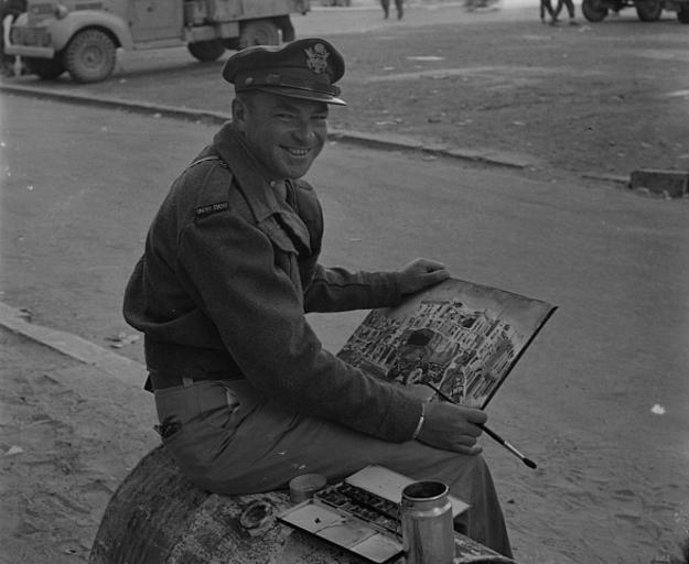 | Keywords: Lt. Milton Marx.jpg en Lieutenant Milton Marx of New York City born January 11 1898 attached to the Public Relations Office of the United States Army Ninth Air Force does some painting in the streets of Tripoli 1943 1943 Library of Congress http //www loc gov/pictures/item/owi2001028101/PP/ U S Government I cropped the original image other versions PD-USGov Uploaded with UploadWizard World War II forces of the United States in Libya People of the United States Air Force 1943 in Libya Milton Marx |