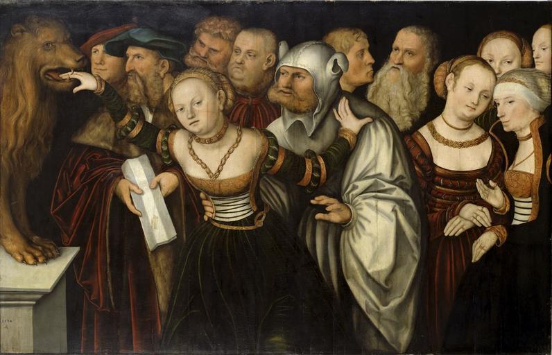 | Keywords: Lucas Cranach d.Ä. - Bocca della Verità (Germanisches Nationalmuseum).jpg Workshop of possibly langSwitch Die Fabel vom Mund der Wahrheit Das Gemälde zeigt eine seit dem Spätmittelalter häufig thematisierte Weiberlist Eine des Ehebruchs angeklagte Frau legt die Hand in den Löwenrachen Sie bekennt nur in den Armen ihres Ehemanns und des Narren gelegen zu haben Da sie die Wahrheit spricht beißt der Löwe nicht zu Der Narr ist in Wirklichkeit ihr verkleideter Liebhaber Von den Zeugen wird er jedoch nicht ernst genommen Die Szene spielt auf die römische Steinmaske bocca della veritá an die der Legende nach jedem Lügner die Hand abbeißt The Fable of the Mouth of Truth Painting on beechwood The painting depicts the frequently employed late medieval theme of the Wiles of Women A woman charged with infidelity lays her hand in the jaws of the lion She confesses only to have lain in the arms of her husband and the fool behind her Because she is speaking the truth the lion does not bite off her hand The fool is in fact her disguised lover but he is not taken seriously by any of the witnesses The scene alludes to the Roman stone mask bocca della veritá which according to legend bites off the hand of every liar 1534 painting beech cm 75 5 117 4 Institution Germanisches Nationalmuseum accession number Gm1108 http //www lucascranach org/digitalarchive php Cranach Digital Archive search FR278 object history credit line exhibition history langSwitch Artist's insignia bottom left winged serpent with elevated wings facing right and dated '1534' Bezeichnet links unten nach rechts ausgerichtetes Schlangensignet mit stehenden Flügeln und 1534 datiert Friedländer Rosenberg 1978 No FR278 http //objektkatalog gnm de/objekt/Gm1108 Germanisches Nationalmuseum PD-old-100-1923 DEFAULTSORT Cranach Lucas 1; Bocca della Verita 1534; Germanisches Nationalmuseum Mythological paintings by Lucas Cranach I Hans Cranach Paintings by Lucas Cranach I in the Germanisches Nationalmuseum Workshop of Lucas Cranach I 1534 paintings 1530s paintings from Germany People with lions in art 1530s paintings in Bavaria Panel paintings Scanned with Heidelberg Tango |