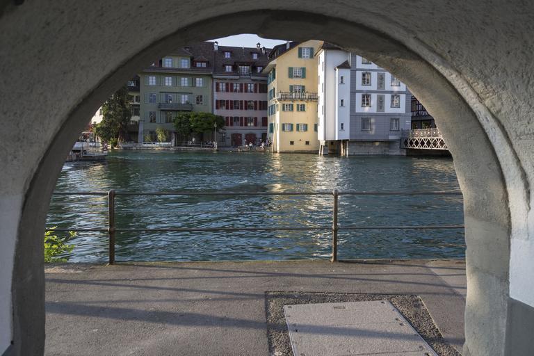 Keywords: lucerne reuss switzerland water river reussteg homes riverside bridge colourful walls