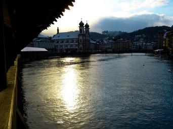 Keywords: lucerne switzerland water river sun church back light
