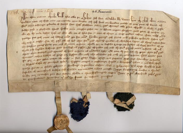 | Keywords: Lucias köpebrev.jpg en A Swedish document from 1375 documenting the selling of a rent by a woman named Lucia sv Lucia kungör att hon med sin sons sina barns och andra arvingars samtycke till skälig man Peter Tomasson har sålt 8 spanns avgäld i Äleby i Gistads socken i Skärkinds härad vilket var hennes morgongåva för 12 mark penningar varvid 6 mark gäller för 1 lödig samt erkänner sig till fullo ha uppburit köpeskillingen Affären uppgjordes på tinget enligt lagens stadganden Skulle godset avhändas Peter Tomasson eller hans arvingar skall utfärdaren ersätta honom med annat likvärdigt gods Fastar var Inge Kanik Arvid i Blistad Olof i Blistad Ander s i Höga Magnus i Uggeltorp Ingjald i Brånnestad Holm i Markeby Håkan Petersson Gunnar i Halleby Godsven i Skyllinge Ingevald Olofsson och Olof i Spolstad Brevet beseglas av Sigge Birgersson Verneke i Hännebjörke och Ernvast Ernilsson i Hestad som gav fasta på häradshövdingens vägnar Brevtext<br> Allom thøm mannom thetta breff høra ælla se · helsar jak Lwcii a æwerdelika medh varom Herra · Thet skal allom mannom witirlikit wara · medh thesso mino nærwarande · vpno brefwe · ath jak Lwcii b medh beradno modhe · ok mins sons ok barna ok flere minna erfwingia godwilia ok kærlek latit hafwir skælikom manne Pætir Thomosone atta spanna affgeld ii Eleby ii Gislastadha sonk ii Skærkinda c hærade d · hwilkit miin morghen gafwo var · ii akrom engiom skoghom · jnnan gars ok wthan · medh allo thy ther vnde lighat hafwir aff aldir ella nw til høra kan ii vato ok thorro ii engo wndan takno / fore tolf marc pæninga · swa goth mynt ath lødhug marc gør siex marc · huilka pæningir jak kennis mik fulleka vp bwrit hafwa eptir thy mik a nøghir · For thy gifwir jak ok latir thæn fornemde Pætir Thomosson quittan ok allaledhis løsan · ok hans arfwa fore · the forscripno pæninge swmmo fore mik ok minom arfwom · Thetta goz er laglika a thinge wp bwdhit ok lagh standit ok er thetta køp laglika · a thinge giort som lagh til sighia / Ok aff hendir jak mik thet fornemde goz · ok minom arfwom · ok til ægnar thøm fornempde Pætir Thomosone ok hans arfwom til ewerdeliko ægho · Ok vare thet swa ath thet gozet thøm fornemde Pætir Thomosone nokra ledhis aff ginge medh laghom ella reth · tha til bindir jak mik medh minom arfwom honom annat swa got goz · ii gen gifwa wthan alt archt ii swa godho læghe · Thesse arw fastamen først Jnge Kanukyr Arfwidir ii Blystadom e 1 Olafwir ther samastad Andir f ii Høghom 2 Magnus ii Wglotorpe 3 · Jngeldir ii Bronastadom g 4 Holme ii Marchaby 5 Haquon Pætirsson Gwnnar ii Halaby 6 · Godzwen ii Skiollunge 7 · Jngewaldir Olafson · Olafwir ii Spolstadhom 8 · Til thesse brefsins stadfestilse ok vitnisbyrd bedhis jak skælika nærwaranda manna incigle · Sigga Birghirsons Verniko ii Hendilbirke 9 · medh Erwasta som fore festene skilde a hærezhofdingians vegna · Datum jn prouincia Skærkind sabato proximo ante Purificacionem anno Domini M o ccc o lxx sexto jn testimonium premissorum · 1375 http //sok riksarkivet se/ Sokord gistad page 8444 postid Dipl_10781 Sveriges riksarkiv Lucia PD-old-100 Uploaded with UploadWizard 1375 documents Documents of Sweden Sweden in the 14th century |
