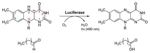 Keywords: Luciferin bacterial reaction.svg inkscape en Reaction of bacterial luciferin de Biolumineszenzreaktion bakteriellen Luciferins own Yikrazuul 2010-07-15 Luciferins Enzyme reactions