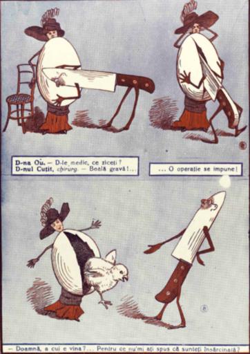 Keywords: Ludovic Bassarab - Poveste de Paști, Furnica, 7 apr 1911.png en Poveste de Paști Easter Story Lady Egg visits Surgeon Knife and discovers that she is pregnant 1911-04-07 Furnica 31/1911 Creator Ludovic Bassarab other versions Custom license marker 2016 08 25 PD-old-auto 1933 Ludovic Bassarab Furnica magazine Caricatures of Romania Comics of Romania 1911 cartoons 1911 comics 1911 lithographs Easter 1911 April 1911 1911 in Romania Easter eggs in art Knives in art Gynaecology in art Pregnancy in art Chicks in art