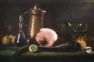 | Keywords: Ludwig Glötzle Brotzeit-Stilleben mit Schinken.jpg Brotzeit-Stilleben mit Schinken Zitrone Brot Äpfeln Trauben Karaffe Römer und Kupferkanne Öl auf Leinwand signiert 53 5 x 81 cm http //www auktion-bergmann de/ Auktionshaus Bergmann by 1929 Creator Ludwig Glötzle PD-old-70 Images from Auktionshaus Bergmann Ludwig Glötzle Still life paintings of meats |
