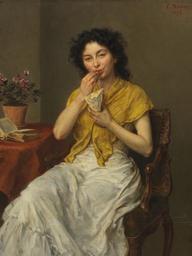 Keywords: Ludwig Knaus - Die Naschkatze (1897).jpg Artwork Creator Ludwig Knaus 1897 oil canvas cm 51 39 5 accession number object history Privatbesitz Berlin um 1949 <br/>Galerie Koller Zürich Auktion 41/2 25 Mai 1979 Lot 5250 als Das Leckermaul <br/>Kunsthandlung Erdmut Pluntke Berlin<br/>Kunsthandlung C Kaupa Karlsruhe Mai 1989<br/>Privatsammlung Süddeutschland credit line exhibition history L Knaus / 1897 ~ upper right signature / date http //www kettererkunst de/kunst/kd/details php obnr 114000857 anummer 413 Ketterer Kunst Hamburg Auktion 413 am 24 05 2014 lot 236 PD-old-auto-1923 1910 DEFAULTSORT Knaus Ludwig; Portrait female 1897 Ketterer 2014 Paintings by Ludwig Knaus Portrait paintings of women Human head tilting Self care Hair in art Sitting People with flowers 1890s portrait paintings Images from Ketterer Kunst