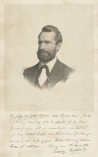 | Keywords: Ludwig Leichhardt3.jpeg Ludwig Leichhardt 1813 “1848 handcolored lithograph image 15 5 × 12 9 cm sheet 32 0 × 22 6 cm Ich hoffe in zwei Jahren von Swan River zurückzukehren;<br /> denn ich habe die Absicht zu den Tropen<br /> hinab zu gehen und in einer Breite von 22° “ 23°<br /> zu der NWest Küste von Australien hinüber zu<br /> dringen und diese gegen Süden bis nach Swan<br /> River zu verfolgen Sydney den 18 April 1846 <br /> Ludwig Leichhardt http //nla gov au/nla pic-an21971599 ca 1850 author File Ludwig Leichhardt2 jpg PD-Art Portraits of Ludwig Leichhardt Engravings in the National Library of Australia |