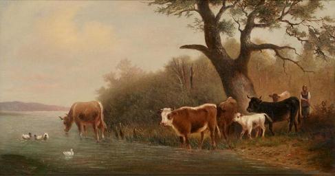 | Keywords: Ludwig Sellmayr - Kühe an der Tränke (1892).jpg 1892 Oil on canvas cm 31 58 object history credit line accession number http //www arcadja com/auctions/de/private/sellmayr_ludwig/kunstwerken/46736/0/ Auktionshaus Zeller Lindau 05 07 2012 lot 2534 via ARCADJA auction results PD-old-100-1923 DEFAULTSORT Sellmayr Ludwig; Shepherd with cattle; Zeller 2012 Ludwig Sellmayr Pastoral landscape paintings Paintings of cattle Drinking animals in art Images from Auktionshaus Zeller | ||||