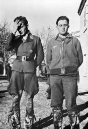 | Keywords: Luftwaffe aircrew captured North Africa 1943.jpg German Luftwaffe aircrew captured in North Africa by U S forces in 1943 <br>Original caption German airmen captured in northwest Africa after their bombing plane had been shot down by Allied fliers The pilot left wears the Iron Cross He and the crew member with him tried to escape after a crash landing LOC-image fsa 8e00916 1943 Farm Security Administration - Office of War Information Photograph Collection Library of Congress frame removed PD-USGov Aircrew of the Luftwaffe Wehrmacht German prisoners of war of World War II |