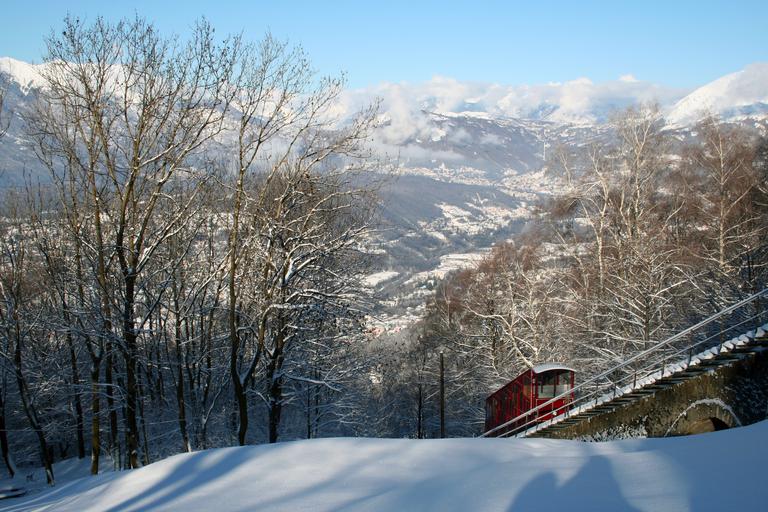 Keywords: lugano switzerland mountains winter snow sol quiet blue sky trees natural landscape wood train transport