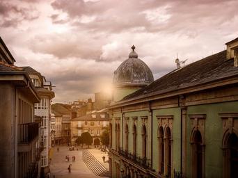 Keywords: lugo galicia spain city sunset dusk light golden plaza buildings clouds sky orange