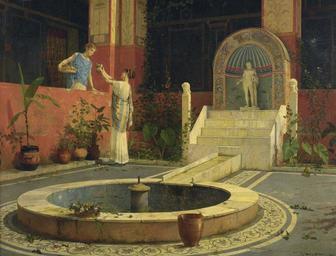 | Keywords: Luigi Bazzani Picking flowers from the courtyard.jpg by 1927 Oil on panel cm 44 5 58 4 object history credit line Bazzani Roma signature/place lower right accession number http //www sothebys com/en/catalogues/ecatalogue html/2012/old-master-19th-century-european-art-n08826 Sotheby's N08826 PD-old-70 Images from Sotheby's Luigi Bazzani Flower picking in art Ancient Rome in art Atriums in art Paintings of courtyards and patios Pottery in painting Ceramic tiles floors in art | ||||