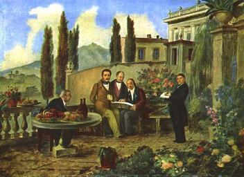 | Keywords: Luigi Deleidi - Donizetti e amici.jpg <br/> Donizetti and friends - oil on canvas cm 68x49 - Bergamo Italy museo donizettiano - from left Bettinelli Gaetano Donizetti Dolci Simone Mayr and the autor Deleidi Donizetti e amici - Olio su tela cm 68x49 - Bergamo museo donizettiano - da sinistra l'oste Bettinelli Gaetano Donizetti Dolci Simone Mayr in piedi l'autore Deleidi Sandro Angelini - Bergamo d'altri tempi - 1964 pag 95 anno 1840 Luigi Deleidi detto il Nebbia 1774-1853 PD-100 Gaetano Donizetti Luigi Deleidi Museo Donizettiano Bergamo Simone Mayr 1840 paintings Romantic paintings in Bergamo |