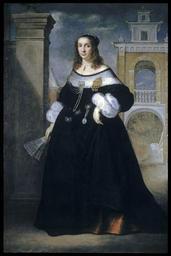 | Keywords: Luigi Primo - Portrait of a Noblewoman of Ancona - Walters 37654.jpg This unidentified noblewoman is dressed in the latest court fashions complete with elaborate jewels and a delicate pocket watch at her waist Such ornaments declare her privileged social status Her fan likewise marks her as a lady as does her gesture of lifting her skirts off the dirty pavement The courtyard behind her may be that of her palace presumably in Ancona Italy since that is the city depicted behind her husband in the companion piece Walters 37 660 Private courtyards and gardens were important in women's lives since the social restrictions on the accepted behavior of upper-class women limited their freedom to stroll in the public streets unless accompanied by their husbands Zeri Italian paintings in the Walters Art Gallery 363 481-482 1650-60 Baroque Oil on canvas Painted surface cm 215 145 5 accession number 37 654 23993 Don Marcello Massarenti Collection Rome date and mode of acquisition unknown 1897 catalogue no 548 as attributed to van Dyck Henry Walters city Baltimore Walters Art Museum Henry Walters Acquired by Henry Walters with the Massarenti Collection 1902 place of origin Italy Walters Art Museum license 2D 17th-century portrait paintings in the Walters Art Museum 1650s Baroque paintings in the Walters Art Museum Luigi Primo Media contributed by the Walters Art Museum needs category review Media contributed by the Walters Art Museum needs artist update 17th-century oil portraits of standing women at full length 1650s Portraits with fans 1650s Portraits with watches 1650s |