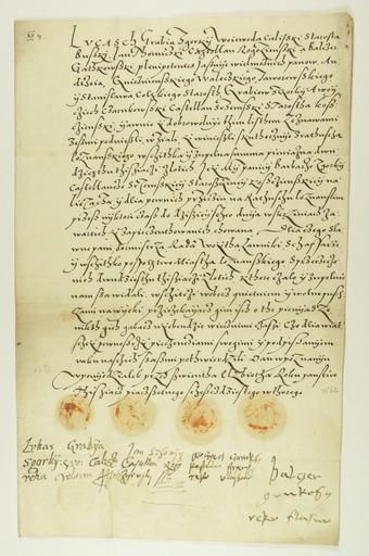 | Keywords: Łukasz z Górki wojewoda kaliski i inni zaświadczają, że odebrali sumy jakiś czas na ratuszu poznańskim przechowywane.png accession number 53/474/D/31 place of creation Poznań Cztery pieczęcie wyciśnięte przez papier i podpisy czterech pełnomocników cc-zero Historical documents of Poznań Łukasz III Górka State Archive in Poznań Uploaded with VicuñaUploader | ||||