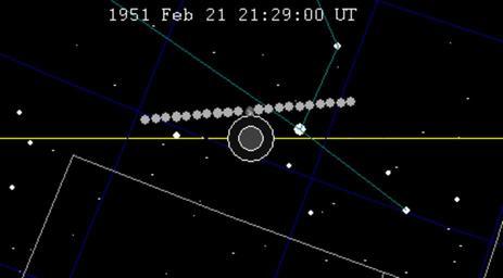 | Keywords: Lunar eclipse chart-1951Feb21.png en wikipedia 2011 October 24 February 1951 lunar eclipse chart The position of the moon and earth's shadow are shown as viewed from center of earth A small parallax effect occurs from specific location on surface of the earth The yellow line is the plane of the ecliptic path of the sun through the sky and hence the center of the earth's shadow The two concentric circles centered on this line show the extent of the umbra and penumbra the zones of full and partial shadow respectively for an object in the moon's orbit The moon is drawn at maximum eclipse and circles for every hour interval of motion thumb 2009-04-11 Own SockPuppetForTomruen wikipedia en SockPuppetForTomruen Original upload log page en wikipedia Lunar_eclipse_chart-1951Feb21 png 2009-04-11 05 50 SockPuppetForTomruen 679×493 11409 bytes <nowiki> Summary February 1951 lunar eclipse chart The position of the moon and earth's shadow are shown as viewed from center of earth A small parallax effect occurs from specific location on surface of the earth The yellow line is the plane of t</nowiki> 2009-04-15 01 47 SockPuppetForTomruen 416×230 9085 bytes <nowiki>replace</nowiki> Lunar eclipse of 2008 February 21 1989 in astronomy 21st century lunar eclipses |