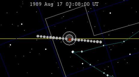 | Keywords: Lunar eclipse chart-1989Aug17.png en wikipedia 2011 October 24 August 1989 lunar eclipse chart The position of the moon and earth's shadow are shown as viewed from center of earth A small parallax effect occurs from specific location on surface of the earth The yellow line is the plane of the ecliptic path of the sun through the sky and hence the center of the earth's shadow The two concentric circles centered on this line show the extent of the umbra and penumbra the zones of full and partial shadow respectively for an object in the moon's orbit The moon is drawn at maximum eclipse and circles for every hour interval of motion thumb 2009-4-11 Own <br />Transferred from http //en wikipedia org en wikipedia SockPuppetForTomruen at http //en wikipedia org en wikipedia en wikipedia SockPuppetForTomruen Original upload log page en wikipedia Lunar_eclipse_chart-1989Aug17 png 2009-04-11 05 53 SockPuppetForTomruen 679×493 12028 bytes <nowiki> Summary August 1989 lunar eclipse chart The position of the moon and earth's shadow are shown as viewed from center of earth A small parallax effect occurs from specific location on surface of the earth The yellow line is the plane of the</nowiki> 2009-04-15 01 48 SockPuppetForTomruen 416×230 9280 bytes <nowiki>replace</nowiki> Lunar eclipse of 2008 February 21 1989 in astronomy 21st century lunar eclipses |