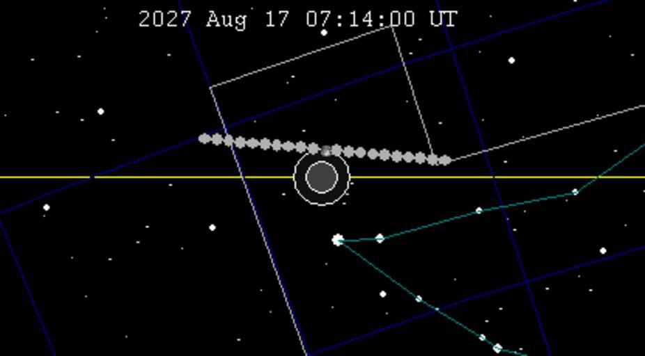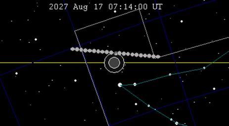 | Keywords: Lunar eclipse chart-2027Aug17.png en wikipedia 2011 October 24 August 2027 lunar eclipse chart The position of the moon and earth's shadow are shown as viewed from center of earth A small parallax effect occurs from specific location on surface of the earth The yellow line is the plane of the ecliptic path of the sun through the sky and hence the center of the earth's shadow The two concentric circles centered on this line show the extent of the umbra and penumbra the zones of full and partial shadow respectively for an object in the moon's orbit The moon is drawn at maximum eclipse and circles for every hour interval of motion thumb 2009-04-11 Own SockPuppetForTomruen wikipedia en SockPuppetForTomruen Original upload log page en wikipedia Lunar_eclipse_chart-2027Aug17 png 2009-04-11 05 53 SockPuppetForTomruen 679×493 9848 bytes <nowiki> Summary August 2027 lunar eclipse chart The position of the moon and earth's shadow are shown as viewed from center of earth A small parallax effect occurs from specific location on surface of the earth The yellow line is the plane of the</nowiki> 2009-04-15 01 50 SockPuppetForTomruen 416×230 9009 bytes <nowiki>replace</nowiki> Lunar eclipse of 2008 February 21 1989 in astronomy 21st century lunar eclipses |
