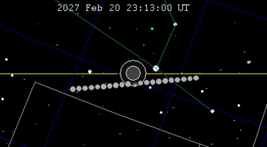 | Keywords: Lunar eclipse chart-2027Feb20.png en wikipedia 2011 October 24 February 2027 lunar eclipse chart The position of the moon and earth's shadow are shown as viewed from center of earth A small parallax effect occurs from specific location on surface of the earth The yellow line is the plane of the ecliptic path of the sun through the sky and hence the center of the earth's shadow The two concentric circles centered on this line show the extent of the umbra and penumbra the zones of full and partial shadow respectively for an object in the moon's orbit The moon is drawn at maximum eclipse and circles for every hour interval of motion thumb 2009-4-11 Own <br />Transferred from http //en wikipedia org en wikipedia SockPuppetForTomruen at http //en wikipedia org en wikipedia en wikipedia SockPuppetForTomruen Original upload log page en wikipedia Lunar_eclipse_chart-2027Feb20 png 2009-04-11 05 52 SockPuppetForTomruen 679×493 11367 bytes <nowiki> Summary February 2027 lunar eclipse chart The position of the moon and earth's shadow are shown as viewed from center of earth A small parallax effect occurs from specific location on surface of the earth The yellow line is the plane of t</nowiki> 2009-04-15 01 50 SockPuppetForTomruen 416×230 9264 bytes <nowiki>replace</nowiki> Lunar eclipse of 2008 February 21 1989 in astronomy 21st century lunar eclipses |