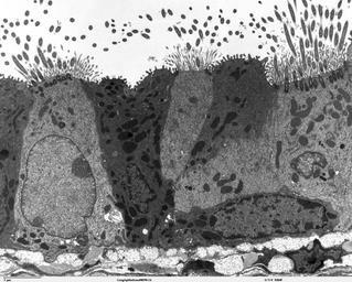 Keywords: Lung epithelium 80294-2.6.jpg Transmission electron microscope image of a thin section cut through the bronchiolar epithelium of the lung mouse which consists of ciliated cells and non-ciliated cells called Clara cells Image shows the ciliary microtubules in transverse and oblique section In the cell apex are the basal bodies that are the anchoring sites for the ciliary axonemes Note the difference in size and shape between the microvilli and the cilia JEOL 100CX TEM http //remf dartmouth edu/imagesindex html http //remf dartmouth edu/images/mammalianLungTEM/source/13 html Louisa Howard Michael Binder PD Louisa Howard and Michael Binder Cell biology