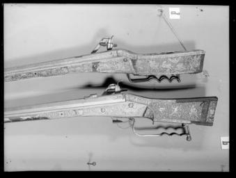 | Keywords: Luntlås-hjullåsbössa - Livrustkammaren - 68581.tif Rund slätborrad blånerad pipa med trumf och åttsidig kammare Rektangulärt böjt svansskruvblad Pipans ovansida täckt av nästan yttäckande påslagen dekor av guld och silver rankverk samt på pipans runda del två ovala kartuscher På kammarenssidofaser vid pipbasen stämplar i form av musselskal LRK vägl 1921 195 Därframför en stående naken kvinna med guldslöja över skötet i h hand ett timglas Tiden därovanför textband BEDENCK D S END På kammarens sidor i rankverket infogade framåt springande hundar rävar och harar av guld och silver Baktill på pipans runda del i den bakre kartuschen en stående kvinna med naken överkropp hellång guldkjol i h hand en guldvåg i v ett svärd med guldfäste Mittpå den runda delen i den främre kartuschen en stående kvinna huvudet profil h lång klänning av guld i h hand ett palmblad av guld i den v en otydlig figur stadsmodell 55 mm från mynningen en graverad björn på ryggen uppåtriktade svinbortsliknande hår sittande och spelande på en säckpipa av guld <br/>Riktmedel Mellan kartuscherna björnen och kornet påslaget en silversiktlist Inlaxade riktmedel siktet saknas korn av silver <br/>Fästning Tre häften Pipan fäst med krysskruv underifrån varbygelskruven samt tre nya pipstift av trä <br/><br/>Hjullås med plant blånerat bakåt i avsatser avsmalnande låsbleck av stål litet rundat ändutskott Hjul fäst med inåtlutande ring samt välvd hjulkapsel Fängpanna utan krutskärm lock med rörlig rektangulär arm Tryckknapp med svagt välvt huvud med skruvskåra Lång hane med kropp med fyrsidigt tvärsnitt innerkanten fasad nästan ringformig hanhals Överkäken lös kort svagt uppåtsvängt fingergrepp med ändvulst Hanskruv med fyrsidigt huvud Kraftig hanfjäder främre delen med rundade kanter bakre hälften med rankdekor ingen studel långt spetsigt åsat löv På låsblecket hjulkapseln och fängpannegaveln påslagen dekor av guld och silver rankverk och bakom hjulet två guldfåglar och en av silver framför hjulet ett bakåtseende rovdjur med kort svans och prickig päls leopard Nedanför säkringsfjädern samma stämpel som på pipan På fängpannelocket en graverad lejonmaskaron på armen ett serafhuvud med vingarna riktade bakåt På hanen graverad bladdekor på ringen på spetsen en maskaron <br/>Säkring Bakom hjulet virvelsäkring med ringformigt fingergrepp fjäder med streckdekor studel med droppformigt svagt välvt löv med mittstreck <br/>Fästning Två låsskruvar <br/>Avtryckare Rak avtryckare med liten ändkula i avtryckarblecket en ställskruv infälld i kolven <br/><br/>Helstock av valnöt med liten vinge kolvlåda och sluten laddstocksränna Nästan yttäckande dekor av vita och grönfärgade beninläggningar hjorthorn Bakplåten samt kantlisterna runt kolvänden saknas nästan helt Utefter stockens kanter lister med beslagsornamentik och flätmönster bakre delen av listen till h om kolvryggen ersatt Vid svansskruvbladets sidor två benplattor med nakna musicerande pojkar till v en lutspelare till h en med fiddla På kolvryggen bakom svansskruvbladet en platta med en mansbyst skäggigt ansikte därbakom ett rankverk och tre papegojor vindruvsklasar fruktfat samt en karyatid På kolvens h sida ovanför kolvlådelocket en figurscen med nakna människor Helenas bortrövande från h ryttare med spjut ersatt båt och två män som hjälper Helena stiga upp i båten stridsscen med 8 stående och en liggande man med klubbor och sköldar till h därom två bågskyttar en ryttare och ytterligare två bågskyttar Kolvlådelock med plan platta av hjorthorn därpå en stående kvinna huvudet profil v klänning och mantel i h hand ett brinnande hjärta i v en pil upptill text VENVS träplattan och fjädern utbytta Framför locket likaså en utbytt benplatta med bladdekor På anslaget en figurscen med Pauli omvändelse till v två ryttare med stegrande hästar en häst utan ryttare Paulus halvliggande på marken och ovanför honom ett moln och Guds bild längst till h ryttare Paulus och ryttarna i antikiserande rustningar Mellan låsskruvarna jaktscen med ryttare med spjut till v hjort som tvingats på knä av två hundar På framstockens sidor jakt- och djurbilder <br/>På v sida bakifrån ryttare med tvåklogaffel och vildsvin som står över en fallen jägare två hundar; jägare vänd mot kolvänden och björn angripen av två hundar; jägare som blåser i horn På den smalare delen därframför hjort och två hundar hund hjort två hundar hornblåsare hund hund och hornblåsare tre hundar två harar samt tre hundar och liggande byte <br/>På framstockens h sida bakifrån björn omgiven av två hundar och två jägare med björnspjut den främre jägaren mindre och placerad på framstockens smalare del; därframför hjort och bakåtvänd jägare med spjut; tre hundar; vildsvin och två bakåtvända jägare den bakre till häst; bakåtvänd hund och framåtvänd hornblåsande jägare; fyra hundar och därframför liggande byte omgivet av två hundar springande hare samt en liten mansfigur <br/>Näsband l 57 mm med bladdekor På h sida saknas de två bakre pipstiftbrickorna den främre ersatt med en nytillverkad kopia av den på v sida Överrörka och spetsrörka i form av benplattor med graverad dekor <br/>På stockens undersida bildfält med de nio muserna på framstocken och sju planeter på kolven På överrörkan en kvinna profil h i v hand ett tvåuddigt föremål Ovanför kvinnan en flammande sol och textband NOVIM MVSE VRANIA den himmelska attribut vanligen en himmelsglob På nederdelen av plattan text till följande bild ERATO den älskliga attribut lyra Fält 2 kvinna helfigur profil v huvudet profil h i händerna en kula glob för Urania överkroppen till knäna och benens nederdel hör ej samman Fält 3 kvinna helbild fas huvudet profil h i h hand en skriftrulle i v bok upptill text CALIOPE den skönstämmiga attribut skrifttavlor o
