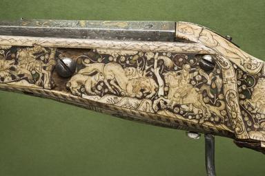 | Keywords: Luntlås-hjullåsbössa Nurnberg - Livrustkammaren - 87451.tif Rund slätborrad blånerad pipa med trumf och åttsidig kammare Rektangulärt böjt svansskruvblad Pipans ovansida täckt av nästan yttäckande påslagen dekor av guld och silver rankverk samt på pipans runda del två ovala kartuscher På kammarenssidofaser vid pipbasen stämplar i form av musselskal LRK vägl 1921 195 Därframför en stående naken kvinna med guldslöja över skötet i h hand ett timglas Tiden därovanför textband BEDENCK D S END På kammarens sidor i rankverket infogade framåt springande hundar rävar och harar av guld och silver Baktill på pipans runda del i den bakre kartuschen en stående kvinna med naken överkropp hellång guldkjol i h hand en guldvåg i v ett svärd med guldfäste Mittpå den runda delen i den främre kartuschen en stående kvinna huvudet profil h lång klänning av guld i h hand ett palmblad av guld i den v en otydlig figur stadsmodell 55 mm från mynningen en graverad björn på ryggen uppåtriktade svinbortsliknande hår sittande och spelande på en säckpipa av guld <br/>Riktmedel Mellan kartuscherna björnen och kornet påslaget en silversiktlist Inlaxade riktmedel siktet saknas korn av silver <br/>Fästning Tre häften Pipan fäst med krysskruv underifrån varbygelskruven samt tre nya pipstift av trä <br/><br/>Hjullås med plant blånerat bakåt i avsatser avsmalnande låsbleck av stål litet rundat ändutskott Hjul fäst med inåtlutande ring samt välvd hjulkapsel Fängpanna utan krutskärm lock med rörlig rektangulär arm Tryckknapp med svagt välvt huvud med skruvskåra Lång hane med kropp med fyrsidigt tvärsnitt innerkanten fasad nästan ringformig hanhals Överkäken lös kort svagt uppåtsvängt fingergrepp med ändvulst Hanskruv med fyrsidigt huvud Kraftig hanfjäder främre delen med rundade kanter bakre hälften med rankdekor ingen studel långt spetsigt åsat löv På låsblecket hjulkapseln och fängpannegaveln påslagen dekor av guld och silver rankverk och bakom hjulet två guldfåglar och en av silver framför hjulet ett bakåtseende rovdjur med kort svans och prickig päls leopard Nedanför säkringsfjädern samma stämpel som på pipan På fängpannelocket en graverad lejonmaskaron på armen ett serafhuvud med vingarna riktade bakåt På hanen graverad bladdekor på ringen på spetsen en maskaron <br/>Säkring Bakom hjulet virvelsäkring med ringformigt fingergrepp fjäder med streckdekor studel med droppformigt svagt välvt löv med mittstreck <br/>Fästning Två låsskruvar <br/>Avtryckare Rak avtryckare med liten ändkula i avtryckarblecket en ställskruv infälld i kolven <br/><br/>Helstock av valnöt med liten vinge kolvlåda och sluten laddstocksränna Nästan yttäckande dekor av vita och grönfärgade beninläggningar hjorthorn Bakplåten samt kantlisterna runt kolvänden saknas nästan helt Utefter stockens kanter lister med beslagsornamentik och flätmönster bakre delen av listen till h om kolvryggen ersatt Vid svansskruvbladets sidor två benplattor med nakna musicerande pojkar till v en lutspelare till h en med fiddla På kolvryggen bakom svansskruvbladet en platta med en mansbyst skäggigt ansikte därbakom ett rankverk och tre papegojor vindruvsklasar fruktfat samt en karyatid På kolvens h sida ovanför kolvlådelocket en figurscen med nakna människor Helenas bortrövande från h ryttare med spjut ersatt båt och två män som hjälper Helena stiga upp i båten stridsscen med 8 stående och en liggande man med klubbor och sköldar till h därom två bågskyttar en ryttare och ytterligare två bågskyttar Kolvlådelock med plan platta av hjorthorn därpå en stående kvinna huvudet profil v klänning och mantel i h hand ett brinnande hjärta i v en pil upptill text VENVS träplattan och fjädern utbytta Framför locket likaså en utbytt benplatta med bladdekor På anslaget en figurscen med Pauli omvändelse till v två ryttare med stegrande hästar en häst utan ryttare Paulus halvliggande på marken och ovanför honom ett moln och Guds bild längst till h ryttare Paulus och ryttarna i antikiserande rustningar Mellan låsskruvarna jaktscen med ryttare med spjut till v hjort som tvingats på knä av två hundar På framstockens sidor jakt- och djurbilder <br/>På v sida bakifrån ryttare med tvåklogaffel och vildsvin som står över en fallen jägare två hundar; jägare vänd mot kolvänden och björn angripen av två hundar; jägare som blåser i horn På den smalare delen därframför hjort och två hundar hund hjort två hundar hornblåsare hund hund och hornblåsare tre hundar två harar samt tre hundar och liggande byte <br/>På framstockens h sida bakifrån björn omgiven av två hundar och två jägare med björnspjut den främre jägaren mindre och placerad på framstockens smalare del; därframför hjort och bakåtvänd jägare med spjut; tre hundar; vildsvin och två bakåtvända jägare den bakre till häst; bakåtvänd hund och framåtvänd hornblåsande jägare; fyra hundar och därframför liggande byte omgivet av två hundar springande hare samt en liten mansfigur <br/>Näsband l 57 mm med bladdekor På h sida saknas de två bakre pipstiftbrickorna den främre ersatt med en nytillverkad kopia av den på v sida Överrörka och spetsrörka i form av benplattor med graverad dekor <br/>På stockens undersida bildfält med de nio muserna på framstocken och sju planeter på kolven På överrörkan en kvinna profil h i v hand ett tvåuddigt föremål Ovanför kvinnan en flammande sol och textband NOVIM MVSE VRANIA den himmelska attribut vanligen en himmelsglob På nederdelen av plattan text till följande bild ERATO den älskliga attribut lyra Fält 2 kvinna helfigur profil v huvudet profil h i händerna en kula glob för Urania överkroppen till knäna och benens nederdel hör ej samman Fält 3 kvinna helbild fas huvudet profil h i h hand en skriftrulle i v bok upptill text CALIOPE den skönstämmiga attribut skrif