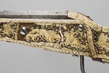 | Keywords: Luntlås- hjullåsbössa Nurnberg - Livrustkammaren - 86522.tif Rund slätborrad blånerad pipa med trumf och åttsidig kammare Rektangulärt böjt svansskruvblad Pipans ovansida täckt av nästan yttäckande påslagen dekor av guld och silver rankverk samt på pipans runda del två ovala kartuscher På kammarenssidofaser vid pipbasen stämplar i form av musselskal LRK vägl 1921 195 Därframför en stående naken kvinna med guldslöja över skötet i h hand ett timglas Tiden därovanför textband BEDENCK D S END På kammarens sidor i rankverket infogade framåt springande hundar rävar och harar av guld och silver Baktill på pipans runda del i den bakre kartuschen en stående kvinna med naken överkropp hellång guldkjol i h hand en guldvåg i v ett svärd med guldfäste Mittpå den runda delen i den främre kartuschen en stående kvinna huvudet profil h lång klänning av guld i h hand ett palmblad av guld i den v en otydlig figur stadsmodell 55 mm från mynningen en graverad björn på ryggen uppåtriktade svinbortsliknande hår sittande och spelande på en säckpipa av guld <br/>Riktmedel Mellan kartuscherna björnen och kornet påslaget en silversiktlist Inlaxade riktmedel siktet saknas korn av silver <br/>Fästning Tre häften Pipan fäst med krysskruv underifrån varbygelskruven samt tre nya pipstift av trä <br/><br/>Hjullås med plant blånerat bakåt i avsatser avsmalnande låsbleck av stål litet rundat ändutskott Hjul fäst med inåtlutande ring samt välvd hjulkapsel Fängpanna utan krutskärm lock med rörlig rektangulär arm Tryckknapp med svagt välvt huvud med skruvskåra Lång hane med kropp med fyrsidigt tvärsnitt innerkanten fasad nästan ringformig hanhals Överkäken lös kort svagt uppåtsvängt fingergrepp med ändvulst Hanskruv med fyrsidigt huvud Kraftig hanfjäder främre delen med rundade kanter bakre hälften med rankdekor ingen studel långt spetsigt åsat löv På låsblecket hjulkapseln och fängpannegaveln påslagen dekor av guld och silver rankverk och bakom hjulet två guldfåglar och en av silver framför hjulet ett bakåtseende rovdjur med kort svans och prickig päls leopard Nedanför säkringsfjädern samma stämpel som på pipan På fängpannelocket en graverad lejonmaskaron på armen ett serafhuvud med vingarna riktade bakåt På hanen graverad bladdekor på ringen på spetsen en maskaron <br/>Säkring Bakom hjulet virvelsäkring med ringformigt fingergrepp fjäder med streckdekor studel med droppformigt svagt välvt löv med mittstreck <br/>Fästning Två låsskruvar <br/>Avtryckare Rak avtryckare med liten ändkula i avtryckarblecket en ställskruv infälld i kolven <br/><br/>Helstock av valnöt med liten vinge kolvlåda och sluten laddstocksränna Nästan yttäckande dekor av vita och grönfärgade beninläggningar hjorthorn Bakplåten samt kantlisterna runt kolvänden saknas nästan helt Utefter stockens kanter lister med beslagsornamentik och flätmönster bakre delen av listen till h om kolvryggen ersatt Vid svansskruvbladets sidor två benplattor med nakna musicerande pojkar till v en lutspelare till h en med fiddla På kolvryggen bakom svansskruvbladet en platta med en mansbyst skäggigt ansikte därbakom ett rankverk och tre papegojor vindruvsklasar fruktfat samt en karyatid På kolvens h sida ovanför kolvlådelocket en figurscen med nakna människor Helenas bortrövande från h ryttare med spjut ersatt båt och två män som hjälper Helena stiga upp i båten stridsscen med 8 stående och en liggande man med klubbor och sköldar till h därom två bågskyttar en ryttare och ytterligare två bågskyttar Kolvlådelock med plan platta av hjorthorn därpå en stående kvinna huvudet profil v klänning och mantel i h hand ett brinnande hjärta i v en pil upptill text VENVS träplattan och fjädern utbytta Framför locket likaså en utbytt benplatta med bladdekor På anslaget en figurscen med Pauli omvändelse till v två ryttare med stegrande hästar en häst utan ryttare Paulus halvliggande på marken och ovanför honom ett moln och Guds bild längst till h ryttare Paulus och ryttarna i antikiserande rustningar Mellan låsskruvarna jaktscen med ryttare med spjut till v hjort som tvingats på knä av två hundar På framstockens sidor jakt- och djurbilder <br/>På v sida bakifrån ryttare med tvåklogaffel och vildsvin som står över en fallen jägare två hundar; jägare vänd mot kolvänden och björn angripen av två hundar; jägare som blåser i horn På den smalare delen därframför hjort och två hundar hund hjort två hundar hornblåsare hund hund och hornblåsare tre hundar två harar samt tre hundar och liggande byte <br/>På framstockens h sida bakifrån björn omgiven av två hundar och två jägare med björnspjut den främre jägaren mindre och placerad på framstockens smalare del; därframför hjort och bakåtvänd jägare med spjut; tre hundar; vildsvin och två bakåtvända jägare den bakre till häst; bakåtvänd hund och framåtvänd hornblåsande jägare; fyra hundar och därframför liggande byte omgivet av två hundar springande hare samt en liten mansfigur <br/>Näsband l 57 mm med bladdekor På h sida saknas de två bakre pipstiftbrickorna den främre ersatt med en nytillverkad kopia av den på v sida Överrörka och spetsrörka i form av benplattor med graverad dekor <br/>På stockens undersida bildfält med de nio muserna på framstocken och sju planeter på kolven På överrörkan en kvinna profil h i v hand ett tvåuddigt föremål Ovanför kvinnan en flammande sol och textband NOVIM MVSE VRANIA den himmelska attribut vanligen en himmelsglob På nederdelen av plattan text till följande bild ERATO den älskliga attribut lyra Fält 2 kvinna helfigur profil v huvudet profil h i händerna en kula glob för Urania överkroppen till knäna och benens nederdel hör ej samman Fält 3 kvinna helbild fas huvudet profil h i h hand en skriftrulle i v bok upptill text CALIOPE den skönstämmiga attribut skri