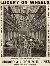 | Keywords: Luxury on wheels.jpg PD-Art Cropped from Image 1885 Chicago Alton jpg Alton Railroad Passenger trains Waiters in art Luxury Advertising in the United States 1885 advertisements Railway advertising Interiors of dining cars in the United States People on trains Dining cars in art Artworks missing infobox template |