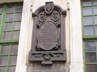 Keywords: LvivRynek1941.JPG pl Tablica na Rynku we Lwowie upamiętniająca ogłoszenie Aktu Odrodzenia Państwa Ukraińskiego w 1941 Own Birczanin Commemorative plaques in Lviv Lubomirski Palace Lviv