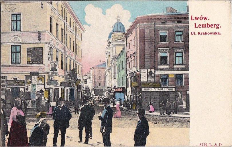 Keywords: Lwow,ul.Krakowska .Jewish.jpg ru Вид на ул К аковскую в авст ийском Львове с вывесками ев ейских магазинов с еди них - вывески на языке идиш 1905 private collection author other versions PD-Art Krakivska Street Lviv Judaism in Lviv Postcards of Austria-Hungary Postcards of Lviv |