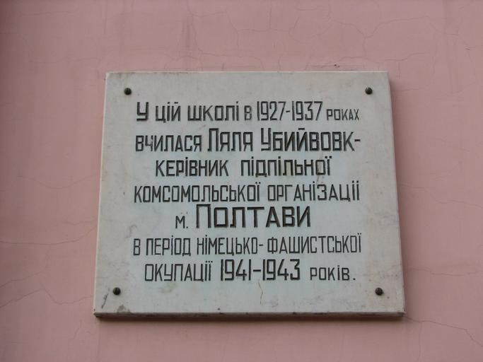 Keywords: Lyalya Ubyjvovk.JPG uk У цій школі в 1927-1937 навчалася Ляля Убийвовк own Tuma26 Commemorative plaques in Poltava 20 Pushkina Street Poltava Elena Ubyivovk