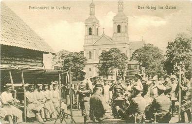 Keywords: Łyntupy, Rynak. Лынтупы, Рынак (1916 ).jpg Лынтупы Łyntupy пляц Рынак plac Rynak Касьцёл З калекцыі Ўладзіме а Ліхадзедава author 1916 PD-old-70 History of Łyntupy Church of Saint Andrew the Apostle in Łyntupy