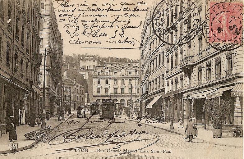 | Keywords: Lyon - Rue Octavio Mey et Gare Saint-Paul (flamme de 1904).jpg Rue Octavio-Mey et la gare Saint-Paul à Lyon vers 1900 Collection personnelle 1900 author Anonymous-EU Gare de Lyon-Saint-Paul Postcards of Lyon Ancien tramway de Lyon 1904 postcards of France Rue Octavio Mey Lyon Lyon in the 1900s |