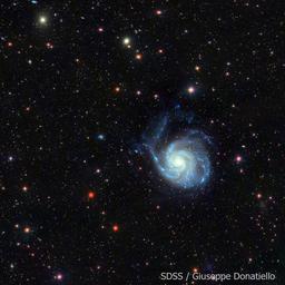 | Keywords: messier 101 pinwheel galaxy ngc 5457 m101 Messier 101 - Pinwheel Galaxy Credit: SDSS / Giuseppe Donatiello (J2000) RA 14h 03m 12.6s +54° 20′ 57″ M101 or NGC 5457 is a face-on spiral galaxy distant 21 million light-years in Ursa Major, first discovered by Pierre Méchain on March 27, 1781. With a diameter of 170,000 light-years it is roughly equal the size of the Milky Way. M101 has five prominent companion galaxies: NGC 5204, NGC 5474, NGC 5477, NGC 5585, and Holmberg IV. Messier 101 - Pinwheel Galaxy Credit: SDSS / Giuseppe Donatiello (J2000) RA 14h 03m 12.6s +54° 20′ 57″ M101 or NGC 5457 is a face-on spiral galaxy distant 21 million light-years in Ursa Major, first discovered by Pierre Méchain on March 27, 1781. With a diameter of 170,000 light-years it is roughly equal the size of the Milky Way. M101 has five prominent companion galaxies: NGC 5204, NGC 5474, NGC 5477, NGC 5585, and Holmberg IV. |
