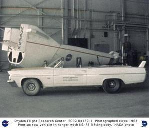 | Keywords: M2-F1 in hangar with Pontiac tow vehicle DVIDS711901.jpg en The M2-F1 Lifting Body is seen here in a hangar with its hotrod Pontiac convertible tow vehicle at the Flight Research Center later the Dryden Flight Research Center Edwards California The car was a 1963 Pontiac Catalina convertible fitted with a 421-cubic-inch tripower engine like those being run at the Daytona 500 auto race The vehicle also had a four-speed transmission and a heavy-duty suspension and cooling system A roll bar was also added and the passenger seat turned around so an observer could watch the M2-F1 while it was being towed The rear seat was removed and a second side-facing seat installed The lifting-body team used the Pontiac for all the ground-tow flights over the next three years The wingless lifting body aircraft design was initially conceived as a means of landing an aircraft horizontally after atmospheric reentry The absence of wings would make the extreme heat of re-entry less damaging to the vehicle In 1962 Dryden management approved a program to build a lightweight unpowered lifting body as a prototype to flight test the wingless concept It would look like a flying bathtub and was designated the M2-F1 the M referring to manned and F referring to flight version It featured a plywood shell placed over a tubular steel frame crafted at Dryden Construction was completed in 1963 The first flight tests of the M2-F1 were over Rogers Dry Lake at the end of a tow rope attached to a hopped-up Pontiac convertible driven at speeds up to about 120 mph This vehicle needed to be able to tow the M2-F1 on the Rogers Dry Lakebed adjacent to NASA's Flight Research Center FRC at a minimum speed of 100 miles per hour To do that it had to handle the 400-pound pull of the M2-F1 Walter Whitey Whiteside who was a retired Air Force maintenance officer working in the FRC's Flight Operations Division was a dirt-bike rider and hot-rodder Together with Boyden Bud Bearce in the Procurement and Supply Branch of the FRC Whitey acquired a Pontiac Catalina convertible with the largest engine available He took the car to Bill Straup's renowned hot-rod shop near Long Beach for modification With a special gearbox and racing slicks the Pontiac could tow the 1 000-pound M2-F1 110 miles per hour in 30 seconds It proved adequate for the roughly 400 car tows that got the M2-F1 airborne to prove it could fly safely and to train pilots before they were towed behind a C-47 aircraft and released These initial car-tow tests produced enough flight data about the M2-F1 to proceed with flights behind the C-47 tow plane at greater altitudes The C-47 took the craft to an altitude of 12 000 where free flights back to Rogers Dry Lake began Pilot for the first series of flights of the M2-F1 was NASA research pilot Milt Thompson Typical glide flights with the M2-F1 lasted about two minutes and reached speeds of 110 to l20 mph A small solid landing rocket referred to as the instant L/D rocket was installed in the rear base of the M2-F1 This rocket which could be ignited by the pilot provided about 250 pounds of thrust for about 10 seconds The rocket could be used to extend the flight time near landing if needed More than 400 ground tows and 77 aircraft tow flights were carried out with the M2-F1 The success of Dryden's M2-F1 program led to NASA's development and construction of two heavyweight lifting bodies based on studies at NASA's Ames and Langley research centers--the M2-F2 and the HL-10 both built by the Northrop Corporation and the U S Air Force's X-24 program with an X-24A and -B built by Martin The Lifting Body program also heavily influenced the Space Shuttle program The M2-F1 program demonstrated the feasibility of the lifting body concept for horizontal landings of atmospheric entry vehicles It also demonstrated a procurement and management concept for prototype flight test vehicles that produced rapid results at very low cost approximately 50 000 excluding salaries of government employees assigned to the project NASA Identifier NIX-EC92-04152 2009-09-23 Glenn Research Center https //www dvidshub net/image/711901 711901 2012-10-10 17 07 WASHINGTON DC US PD-USGov NASA M2-F1 Images from DoD uploaded by Fæ |