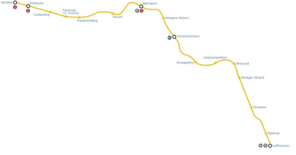 Keywords: M2.svg A geographical map of the Copenhagen Metro ™s M2 line self-made based upon public-domain Image M2 line png by en User Ghent 2007-12-30 DavidArthur Copenhagen Metro maps SVG maps of Denmark
