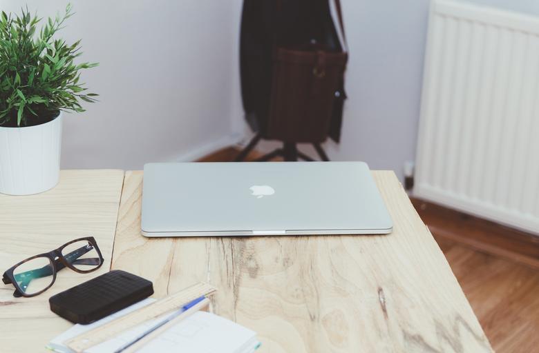 Keywords: macbook laptop computer technology desk office business creative eyeglasses notepad notebook ruler pen wood plant