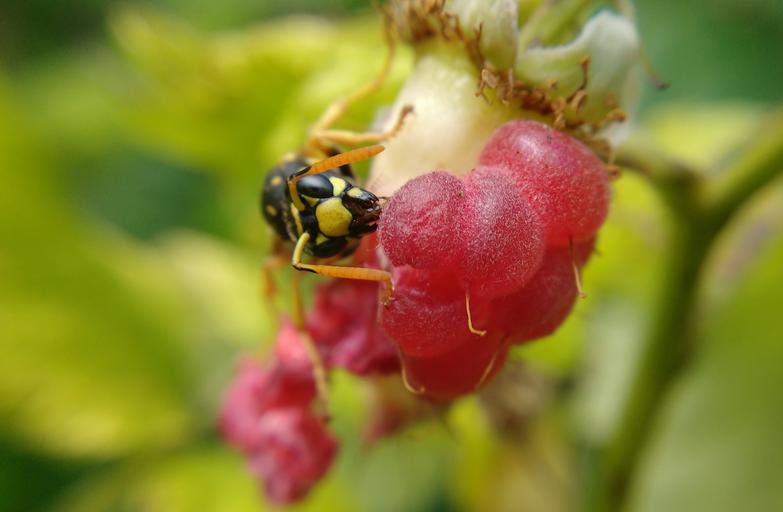 Keywords: macro raspberry summer nature insect wasp flower wasp eating a raspberry garden