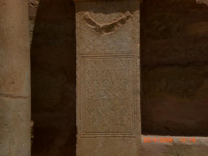 | Keywords: Madaure21.JPG fr Ruines du site antique Madaure Madaura Madaurius M'daourouch Stèle funéraire d'époque romaine es Inscripción funeraria romana en las ruinas de Madauras M'daourouch Argelia correspondiente con CIL VIII 4744 D is M anibus s acrum / C aius Matti/us Quir ina / Hono/ratus p ius / vix it a nnos LX/ h ic s itus e st own samir bouali 2008-04-22 watermark Ancient Roman inscriptions in Madaure CIL VIII 004744 Dis Manibus inscriptions | ||||