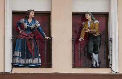 Keywords: madrid spain capital window fig statue fashion clothing balcony parapet man woman entertainment rose flirt historically