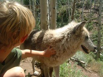 Keywords: Maggie Pets.JPG en Magpie Maggie being petted by a young visitor own Metamort Juy 10th 2008 Canis lupus lupus at Mission Wolf