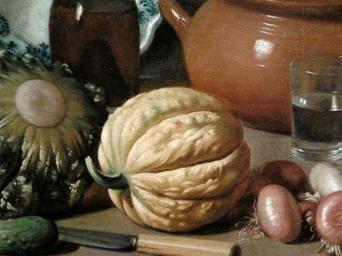 | Keywords: Magini Still life with a copper jug (detail) 01.jpg Artwork Creator Carlo Magini firsthalf other date century 18 oil canvas Institution National Museum Warsaw accession number M Ob 681 212800 object history credit line own See below PD-old-100 DEFAULTSORT 1750 before; Still life with a copper jug Paintings by Carlo Magini in the National Museum in Warsaw Baroque still life paintings of food Cucumbers in art Pumpkins in paintings Onions in art Drinking glasses in paintings | ||||
