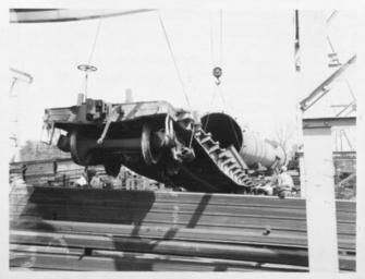 Keywords: steel steel construction steelconstruction steel industry steelindustry structural steel structuralsteel construction equipment constructionequipment construction industry constructionindustry buildings houses blackandwhite monochrome black and white Photograph of a railroad car being prepared to transport a smokestack built for the Magnolia Petroleum Company. The smokestack unit was built and installed by Alcorn Combustion Company out of Philadelphia, Pennsylvania, using materials provided by John Dollinger Jr., Inc. A railroad car is being lowered onto tracks in the foreground. The smokestack can be seen laid upon railcars in the background. Several men are in the area to supervise the operation. Photograph of a railroad car being prepared to transport a smokestack built for the Magnolia Petroleum Company. The smokestack unit was built and installed by Alcorn Combustion Company out of Philadelphia, Pennsylvania, using materials provided by John Dollinger Jr., Inc. A railroad car is being lowered onto tracks in the foreground. The smokestack can be seen laid upon railcars in the background. Several men are in the area to supervise the operation.