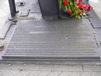 | Keywords: Mahnmal Gerichtsgefängnis Hannover vor dem Pavillon 8. Mai 1989 Befreiung vom Nationalsozialismus alle Sprachen 004.jpg Nazism in Hanover between culture center Pavillon Raschplatz place and the Hannover Central Station Hannover Hauptbahnhof Hannover Hbf Mahnmal Gerichtsgefängnis Hannover vor dem Pavillon wurde am 8 Mai 1989 eingeweiht dem Jahrestag der Befreiung vom Nationalsozialismus Das von Hans-Jürgen Breuste entworfene Mahnmal zeigt verschiedene unterbrochen vertikal angeordnete Stahlgitter-Platten die von einem großen Andreaskreuz gekreuzt werden Die liegende Inschrift am Fuß des Mahnmals weist über die Hamburger Allee in Richtung Raschplatz bis wohin die Mauern des abgebrochenen Gerichtsgefängnisses reichten Die Inschrift lautet Zitat Hier stand bis zum Abriß 1964 das Gerichtsgefängnis Hannover in dem von 1933 bis 1945 zahlreiche Gegner und Gegnerinnen des Nationalsozialismus inhaftiert waren Sie kamen aus allen Schichten der Bevölkerung bis 1937 vor allem aus der Arbeiterschaft - darunter Sozialdemokraten Kommunisten und Gewerkschafter Außer ihnen wurden hier Männer und Frauen aus verfolgten Minderheiten wie Sinti Zeugen Jehovas und Homosexuelle gefangengehalten Während des Zweiten Weltkrieges haben hier auch ausländische Zwangsarbeiter und Zwangsarbeiterinnen gelitten In diesem Gefängnis waren viele Mitglieder der hannoverschen Sozialistischen Front einer der größten Widerstandsgruppen der SPD gegen den Nationalsozialismus inhaftiert Von ihnen werden Gustchen Breitzke Fritz Lohmeyer Therese Wittrock und Fritz Wulfert genannt Zu einer Widerstandgruppe der Sozialistischen Arbeiterpartei gehörte Otto Brenner Von 1937 bis 1943 saß hier der Vorsitzende der KPD Ernst Thälmann in Einzelhaft Stellvertretend für die Verfolgten aus dem kommunistischen Widerstand werden Paul Arndt Marianne Baecker Grete Hoell und Walter Krämer genannt Das Mahnmal Gerichtsgefängnis erinnert daran daß sich Justiz und Polizei als Helfershelfer des Faschismus betätigten Hier war ein Ort der Denunziation an dem Menschen willkürlich und aus politischen Gründen inhaftiert waren own Rainer Hoffschildt 2005-05-18 Memorials in Hannover Mahnmal Gerichtsgefängnis Hannover Oststadt Hannover Monuments and memorials to victims of National Socialism in Lower Saxony Holocaust memorials in Hannover Lister Meile Hannover Mahnmal Gerichtsgefängnis Hannover Grete Hoell Jehovah's Witnesses in Germany |