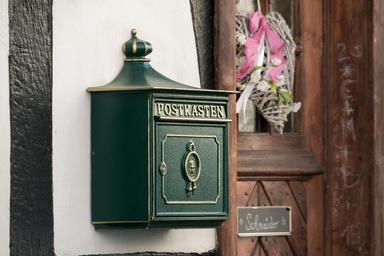Keywords: mailbox post letter boxes green gold blacksmithing old metal input box truss fachwerkhaus communication germany