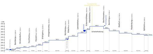 | Keywords: Main-Donau-Kanal-Höhenprofil.svg Grafik des Höhenverlaufs des Main-Donau-Kanals Beschrieben sind die Höhen der Haltung über NN sowie die Länge der Kanalabschnitte die Schleusen mit ihrem jeweiligen Hub Zusätzlich sind die beiden großen Wasserspeicher die beiden großen Häfen und die Lage der Hauptwasserscheide eingezeichnet Beide Achsen für sich sind maßstabsgetreu; die Y-Achse ist gegenüber der X-Achse 166-fach überhöht Graphic of the Rhine-Main-Danube Canal Own 2007-01-19 jailbird Main-Danube Canal |