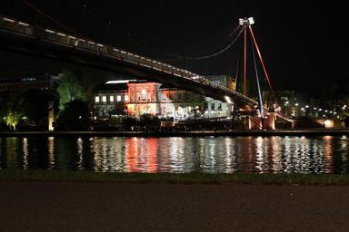 Keywords: main frankfurt staedel bridge pedestrian bridge water river transition suspension bridge crossing mirroring bridge construction stretched red architecture enlightened museum mueseumsufer main banks