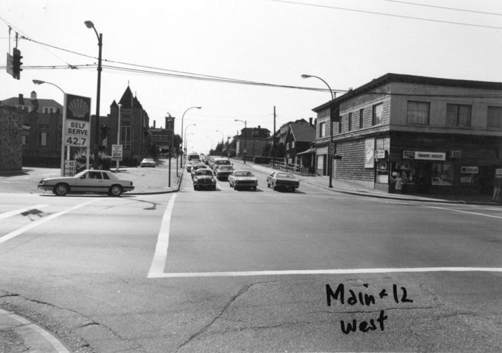 | Keywords: blackandwhite monochrome outdoor road intersection vehicle car black and white Main Street at East 12th Avenue looking west, circa-1980. [City of Vancouver Archives photo] Main Street at East 12th Avenue looking west, circa-1980. [City of Vancouver Archives photo] |